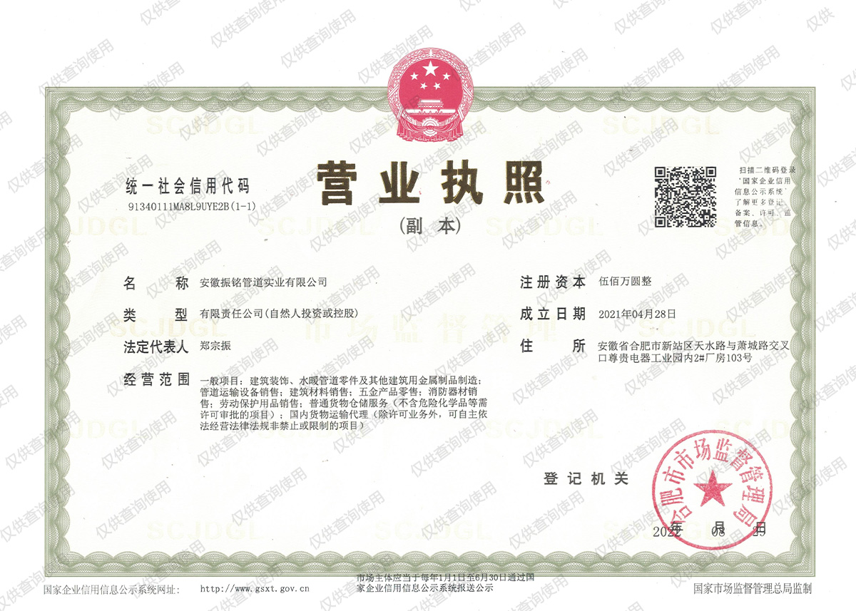 安徽振銘管道實(shí)業(yè)有限公司,始創(chuàng)于2000年6月,總部位于合肥市新站區(qū)天水路2758號(hào)。公司產(chǎn)品與服務(wù)輻射全省,先后成立大客戶(hù)部、華東、蚌埠、阜陽(yáng)、安慶和宿州分公司,并配套設(shè)立了良好的售后服務(wù)保障體系,是一家高可靠性的消防管道供應(yīng)商。